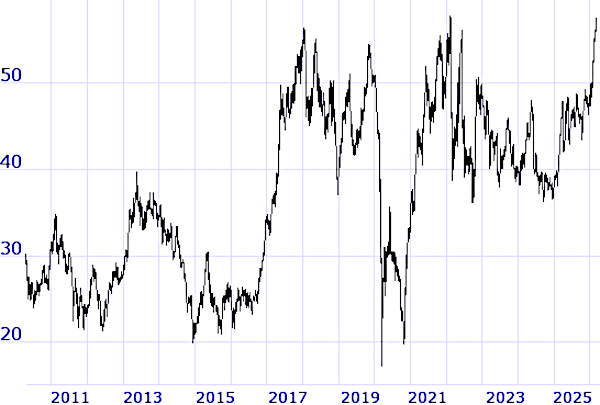 Chartkommentar: Bereits Ende 2017 und dann nochmal Anfang 2022 ist die OMV-Aktie massiv hochgelaufen, um hernach wieder einzuknicken. Jetzt unternimmt der Titel wieder einen Höhenlauf. Kurzfristig bin ich vor dem Hintergrund der aktuellen Nachrichtenlage eher vorsichtig mit großen Renditeversprechen. Spätestens langfristig sehe ich die Austria-Aktie aber klar oberhalb der bisherigen Hochkurse.
