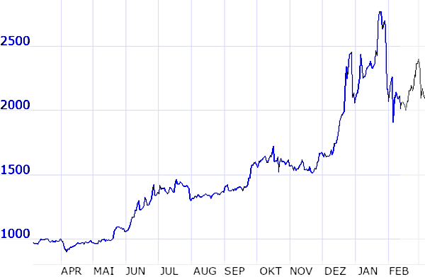 Chartkommentar: Ungeachtet des jüngsten Kursrücksetzers hat sich die Platin-Notierung auf Jahressicht immer noch verdoppelt. Wichtig ist nun, dass die Marke von 2.0000 USD ungefähr hält.