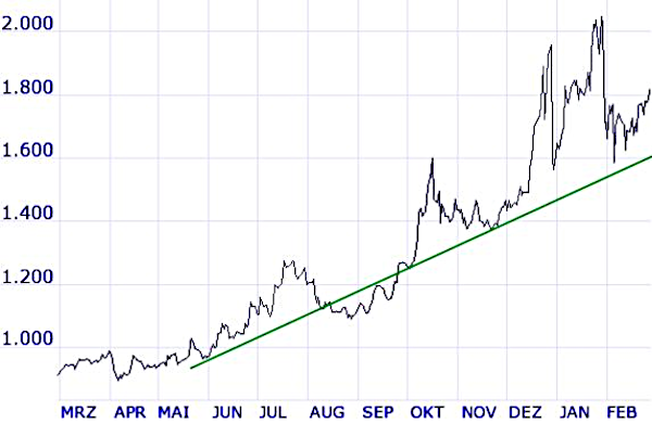 Chartkommentar: Anfang Februar setzte Palladium abrupt um rund 20 % zurück. Der Rückgang ist noch nicht kompensiert. Dennoch gilt: Ungeachtet des bösen Rücksetzers bleibt der Aufwärtstrend – hier grün eingezeichnet – intakt.